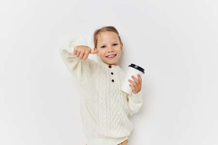 little girl in white sweater glass with drink light background