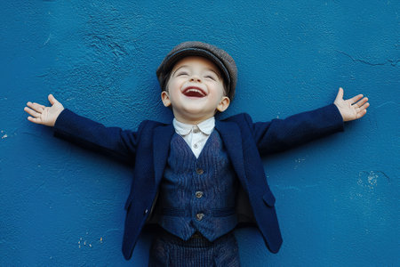 A happy young boy in a suit and cap smiles with open arms against a blue wall.