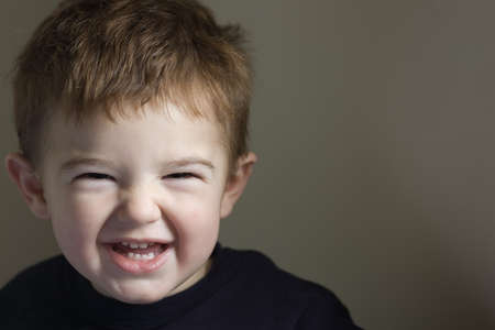 Portrait of a cute boy laughing. Studio shot over grey background.
