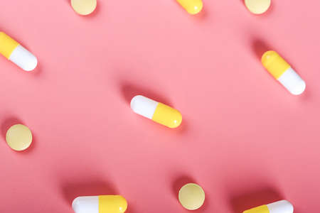 Different medication pills on pink background. Healthcare, medical concept