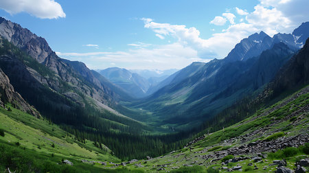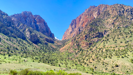 Picturesque gorge with rocky mountains and green slopes. Mountain range with a green valley with trees in between. Amazing nature of Tajikistan. Mountain view from Lake Iskanderkul