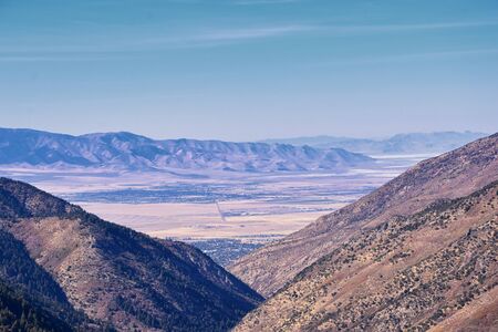 Landscape views of Tooele from the Oquirrh Mountains hiking and backpacking along the Wasatch Front Rocky Mountains, by Kennecott Rio Tinto Copper mine, by the Great Salt Lake in fall. Utah, America.