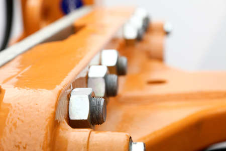Construction machines concept. Detailed closeup of screw and bolts on indrustrial machinery