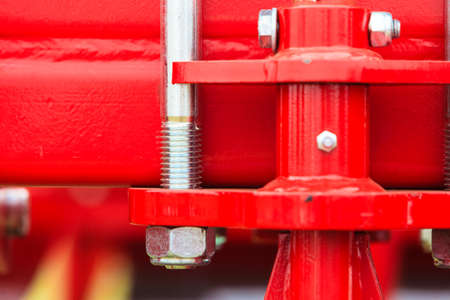 Agriculture equipment concept. Abstract detailed close up of red machinery.