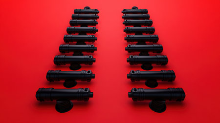 This image features a striking arrangement of black objects against a vibrant red background, creating a bold and modern aesthetic suitable for various creative projects.