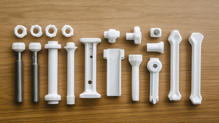 This image features a collection of white plastic fasteners and bolts arranged neatly on a wooden surface, ideal for showcasing modern industrial tools and components.