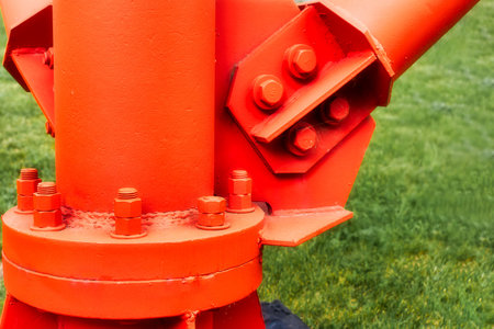 Bolted connection of metal support of mast or pillar close-up. Industrial wear-resistant all-weather paint for metal structures. background..