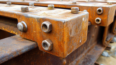 A detailed close-up of industrial metal framework showcasing bolts and connectors. This image captures the tactile texture of raw steel and intricate assembly.