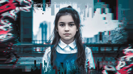 Digital glitches create a vibrant aesthetic in urban landscape of modern city