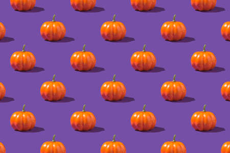 Many Orange Halloween pumpkin on purple background. Minimal Holiday season concept pattern background. 3D Rendering.