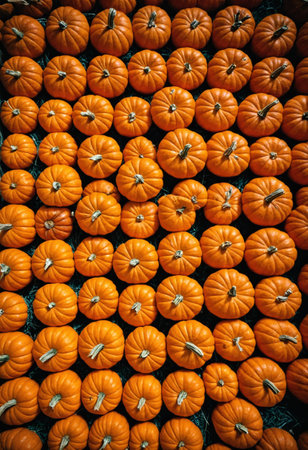 Bright orange pumpkins arranged closely together, capturing the essence of autumn and harvest time.