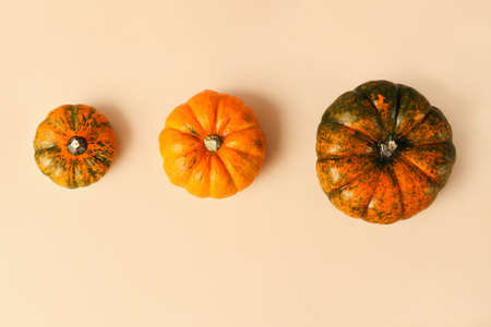 Three different sized pumpkins - from small to large on the beige background. Copy space for text.