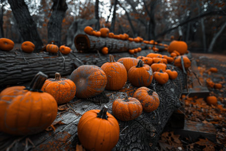 Orange pumpkins piled up on a rustic farm during autumn harvest, seasonal scenery..