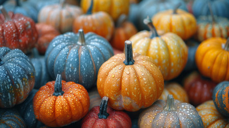 Thanksgiving and Harvest Festival. variety of pumpkins, their vibrant colors and textures ranging from smooth orange to warty green, representing the diversity of natures gifts.