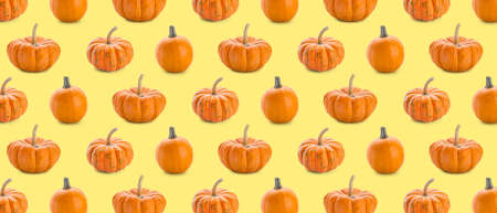 Pumpkin seamless pattern on beige background. Banner. Halloween pumpkin background. Autumn concept. Side view.