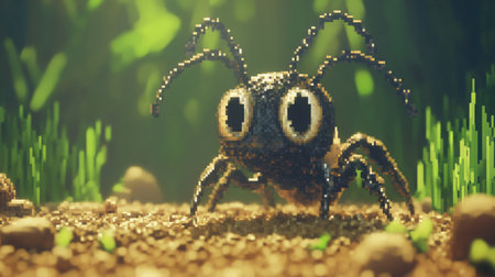 Chibi baby ant in pixel art, front-facing, in a dirt environment with tiny rocks and grass blades towering above, Nintendo game screenshot