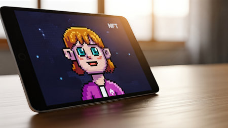 Tablet showcases pixel art NFT character with bright colors and intricate details, highlighting the fusion of technology and digital art in the cryptocurrency landscape