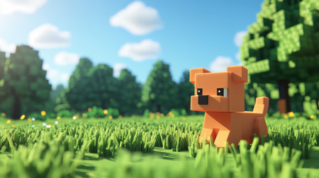A charming blocky dog stands on a vibrant green field under a bright blue sky. Towering trees frame the scene, creating a joyful, playful atmosphere.