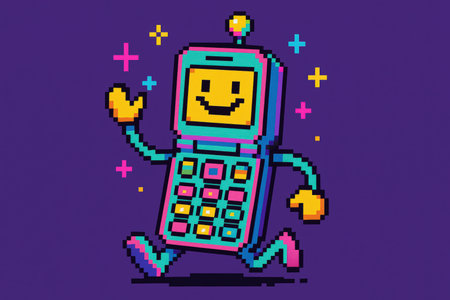 A vibrant pixel art illustration of a 90s retro phone with a smiling face, set against a purple background. The design features bright colors and playful elements, evoking nostalgia.