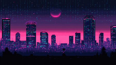 A cyberpunk-inspired city skyline with neon-lit skyscrapers.