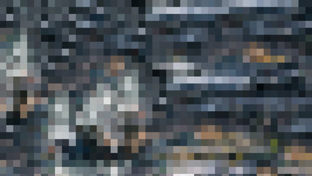 A vibrant abstract pattern composed of numerous tiny squares in a gradient of purple, blue, yellow, and green, creating a pixelated effect.