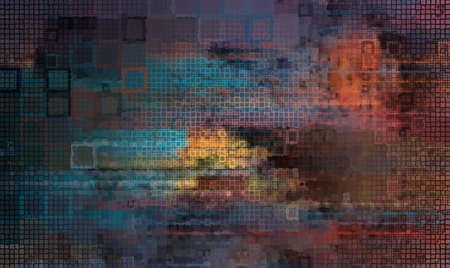 A colorful abstract painting of a landscape with a blue sky and orange clouds. The painting is made up of many small blocks of color, giving it a textured and dynamic appearance