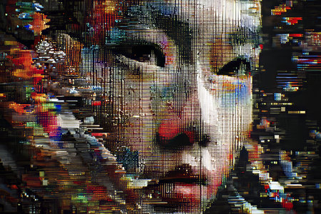 Glitch effect creates a distorted portrait with vibrant colors and sharp contrasts