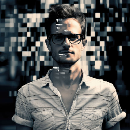 The man's face disintegrates into pixels. Concept: matrix, illusion of reality, Mandela effect, conspiracy theories. High quality photo