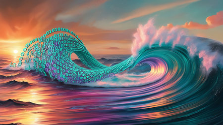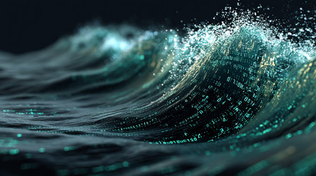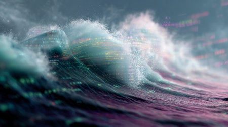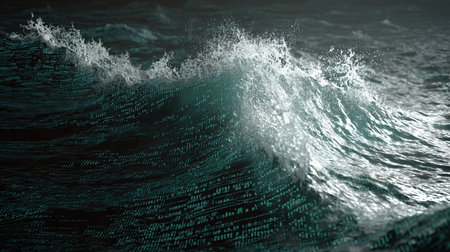A Data waves crashing on shore symbolize information overload and business insight, creating dynamic visual