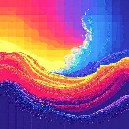 A dynamic wave of vibrant, colorful pixels crashes against a digital horizon, creating a stunning visual representation of data flow, creative energy, and technological disruption. This abstract background evokes a sense of movement and innovation, perfect for modern design projects.