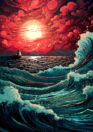 This striking image captures a surreal red wave with a digital texture, reflecting the beauty of nature during sunset. The energetic movement and vibrant colors create a captivating atmosphere.
