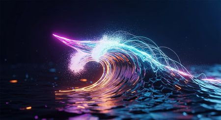 A vibrant ocean wave crests, illuminated with cyan and magenta glowing lines.