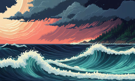 Sea storm landscape, big waves. Ai generated 8bit pixel game scene. Dark sky with grey heavy clouds and huge splashing waves creating a thrilling marine atmosphere and immersive gaming experience