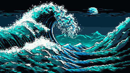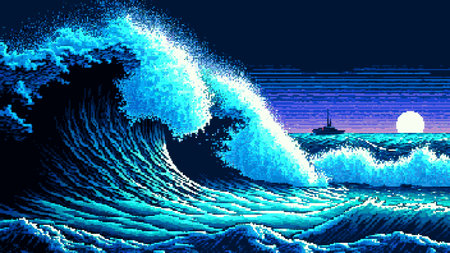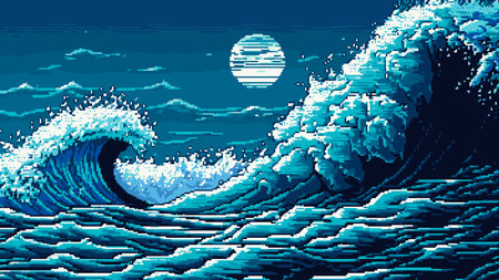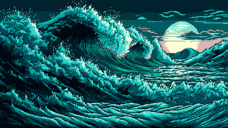 Generative ai night sea storm waves landscape. 8Bit pixel art game background, captures the intensity and power of the turbulent sea. Striking pixelated scene with full moon and tsunami in the ocean
