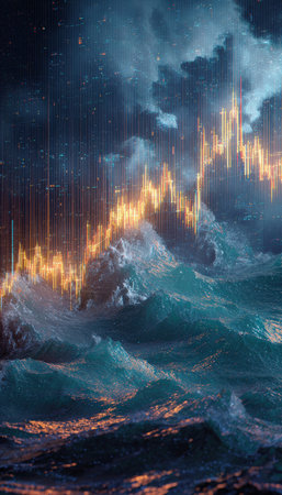Digital art depicting financial graphs morphing into storm waves, symbolizing market volatility. Dramatic lighting enhances the surreal and metaphorical atmosphere.