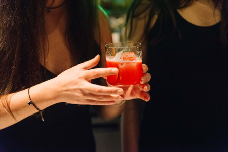 Close-up of a woman holding a red cocktail with ice cubes in a lowball glass during a social event or night party.
