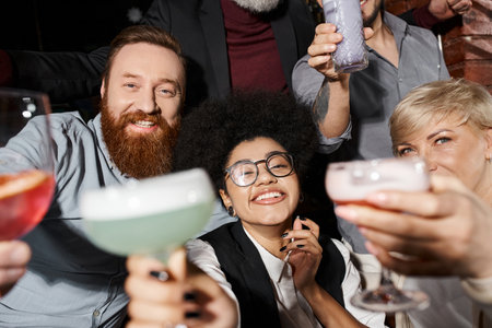 happy bearded man and african american woman with cocktails looking at camera near colleagues in bar