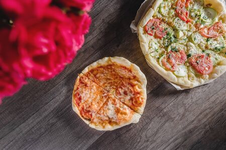 Appetizing pizza on a wooden table, on a tray, with a bouquet of roses. The concept of food and pastime.