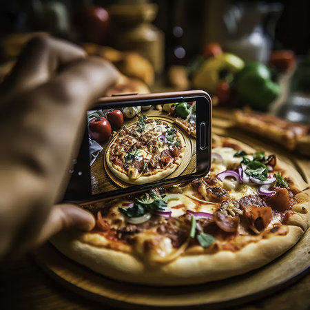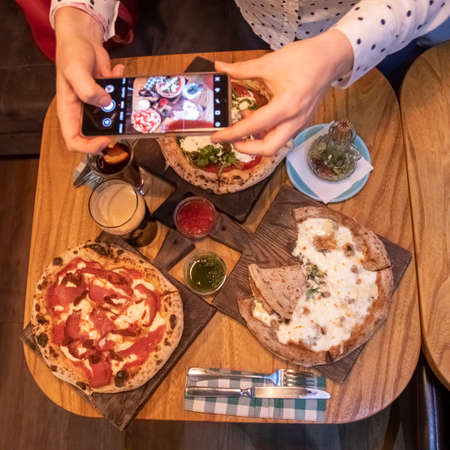 female hands takes pictures on a smartphone table with a delicious pizza in a restaurant. top view