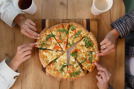 Close-up image of friends sharing traditional Italian pizza and drinking tea in a cafe