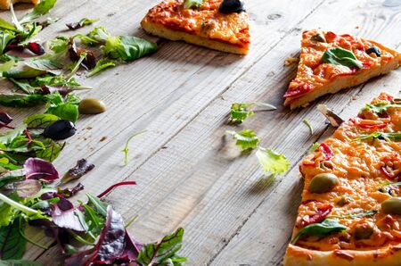 Italiian pepperoni pizza slice ready to serve and white plast on a rustic wooden table top view.
