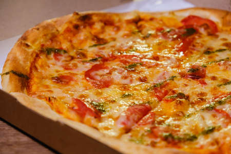 Close-up of Margarita pizza in a disposable dish. Top view of takeaway food in a fast food cafe. On photo - mozzarella cheese, tomatoes, and red basil. The classic recipe. Food for family and friends.