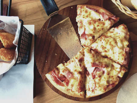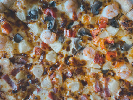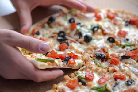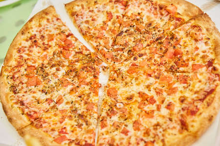 A boring fast food dish pizza. Italian food. Cooking in a restaurant or with your own hands at home.