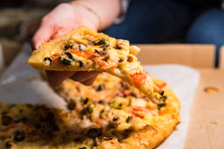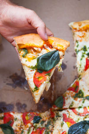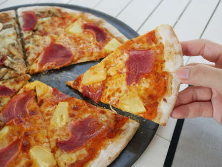 Hand taking a slice of pizza from pizza box. Big Hawaii pizza without one piece. Top view on Hawaii pizza. Concept for italian food, street food, fast food, quick bite.