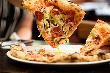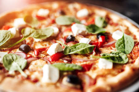 Close Up of Tasty Hot Pizza with Bacon, pepperoni sausage, ham, mozzarella cheese, sweet pepper, herbs, red onion. Food to order.