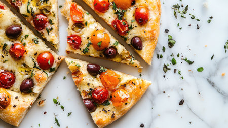 A close-up shot of sliced focaccia featuring vibrant cherry tomatoes and olives, beautifully arranged on a marble surface, perfect for a savory snack or appetizer.