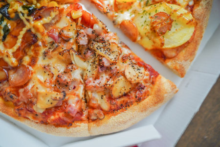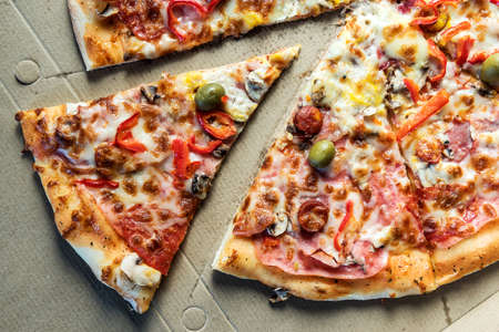 Fresh pizza with four flavors and a cut piece on a thin dough top view. Pizza on a thin dough close-up