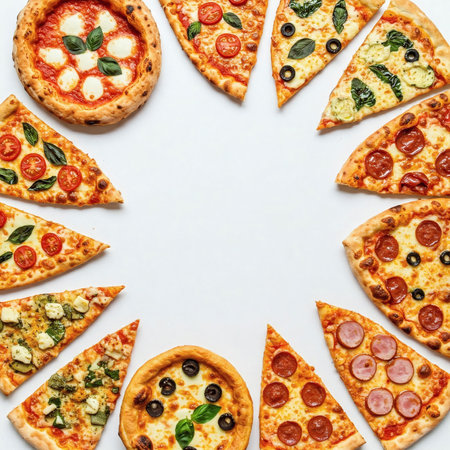 A stunning display of freshly baked margherita pizza slices adorned with vibrant basil leaves on a sleek marble surface, perfect for culinary inspiration.