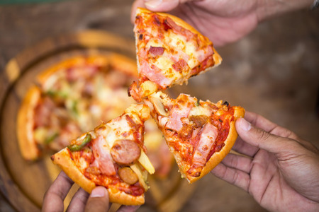 Three piece of Pizza with Mozzarella cheese,Cheddar cheese on wooden background.