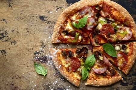 Homemade delicious meat pizza on a rustic wooden background. Top view with copy space.